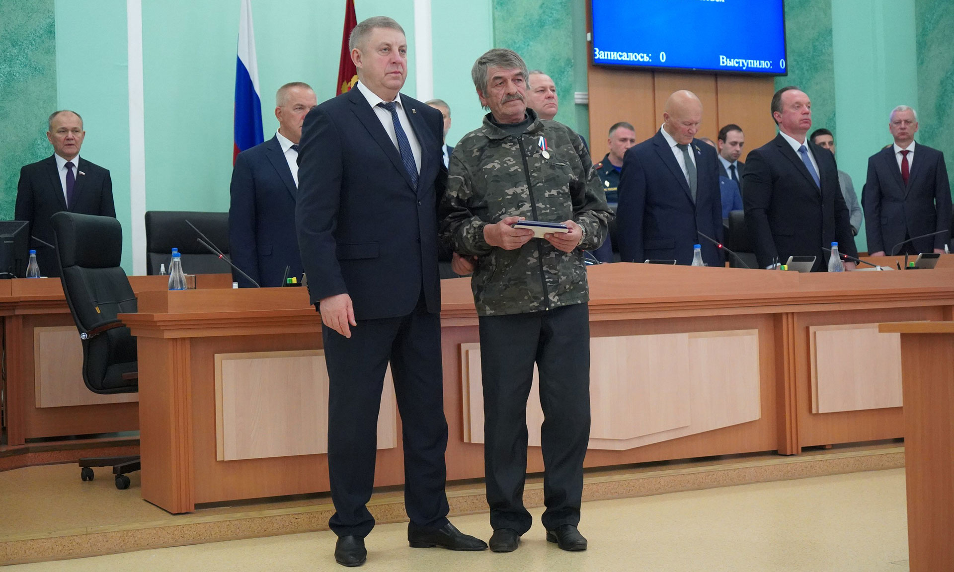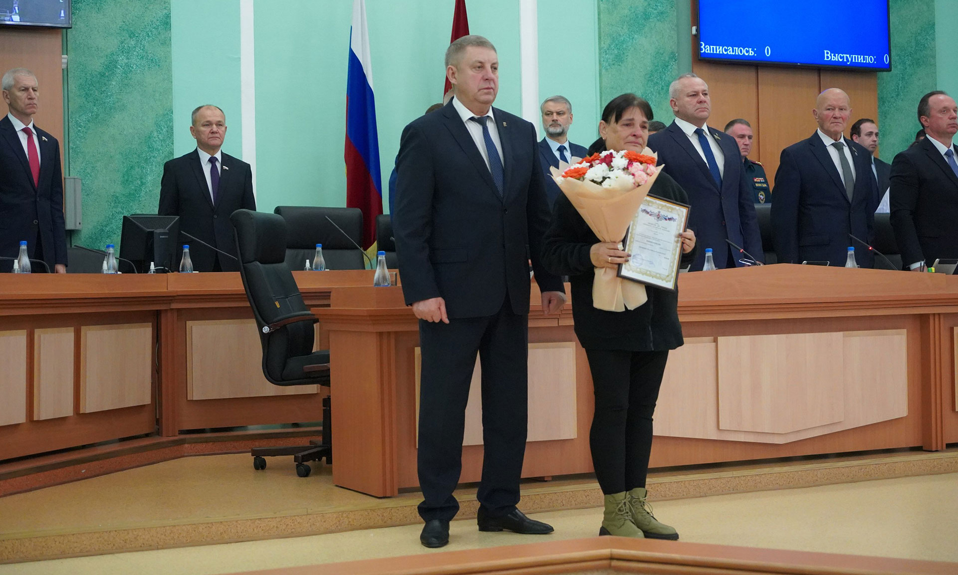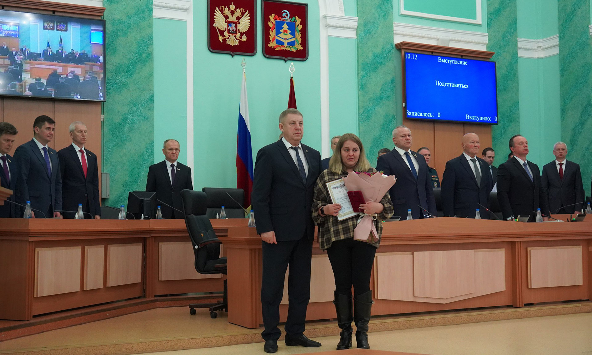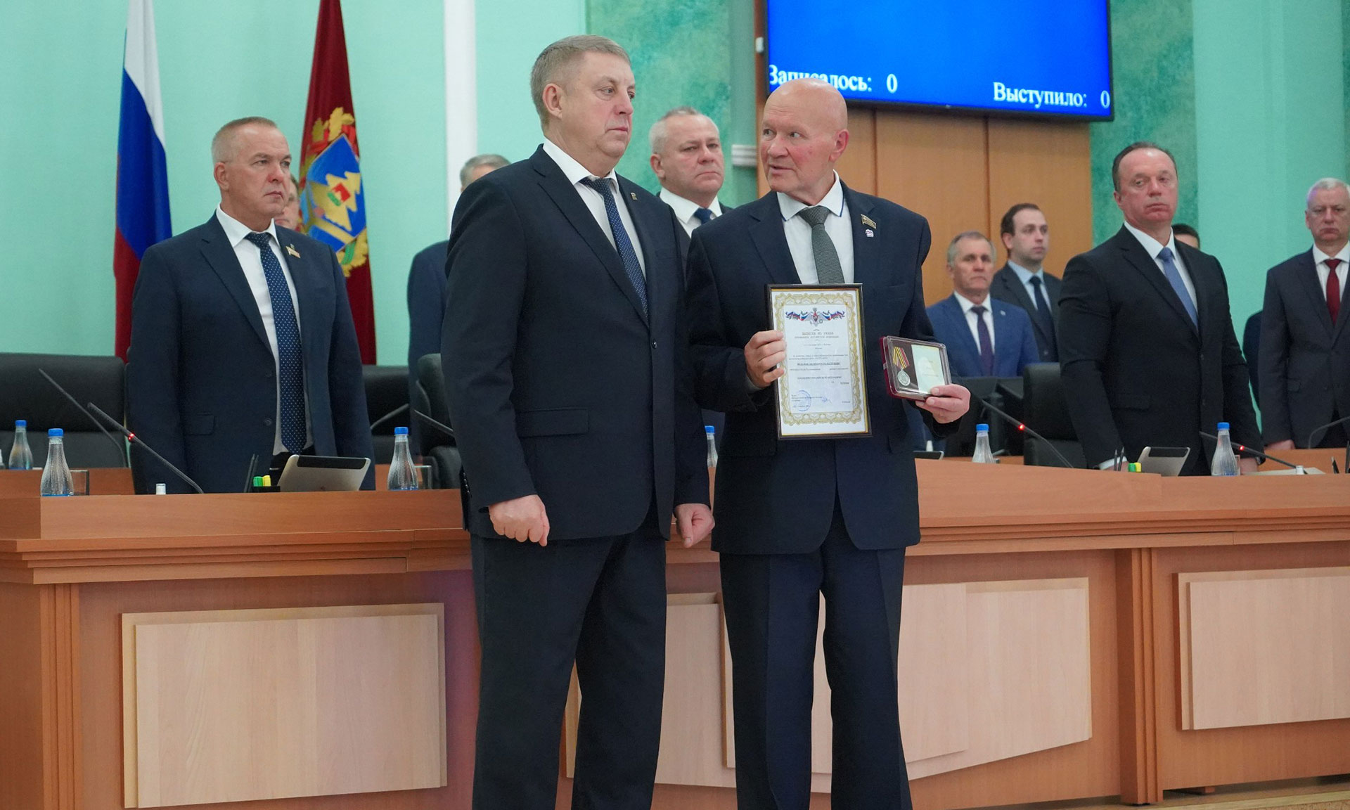 Перед обсуждением основной повестки заседания Александр Богомаз вручил родным Героев государственные награды. За мужество, отвагу и самоотверженность, проявленные при исполнении воинского долга, орденом Мужества посмертно награждены Александр Сергеевич Байдак, Александр Александрович Зубарь, Николай Михайлович Король, Илья Александрович Сиваков, медалью «За храбрость» II степени — Игорь Владимирович Пронин.